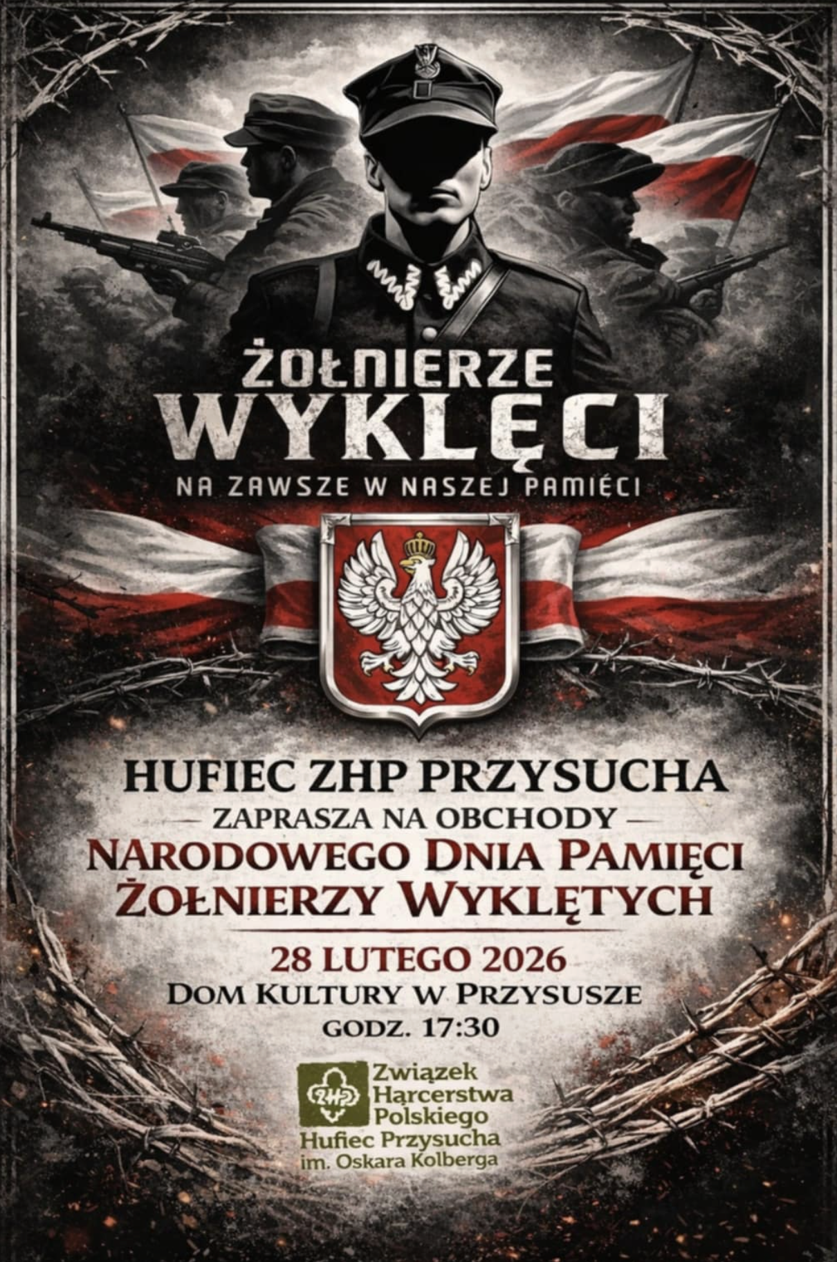 W imieniu ZHP Hufiec Przysucha im. Oskara Kolberga, serdecznie zapraszamy mieszkańców Przysuchy i okolic na uroczyste Obchody Narodowego Dnia Pamięci Żołnierzy Wyklętych, które odbędą się 28 lutego 2026 roku o godzinie 17:30 w Domu Kultury w Przysusze.