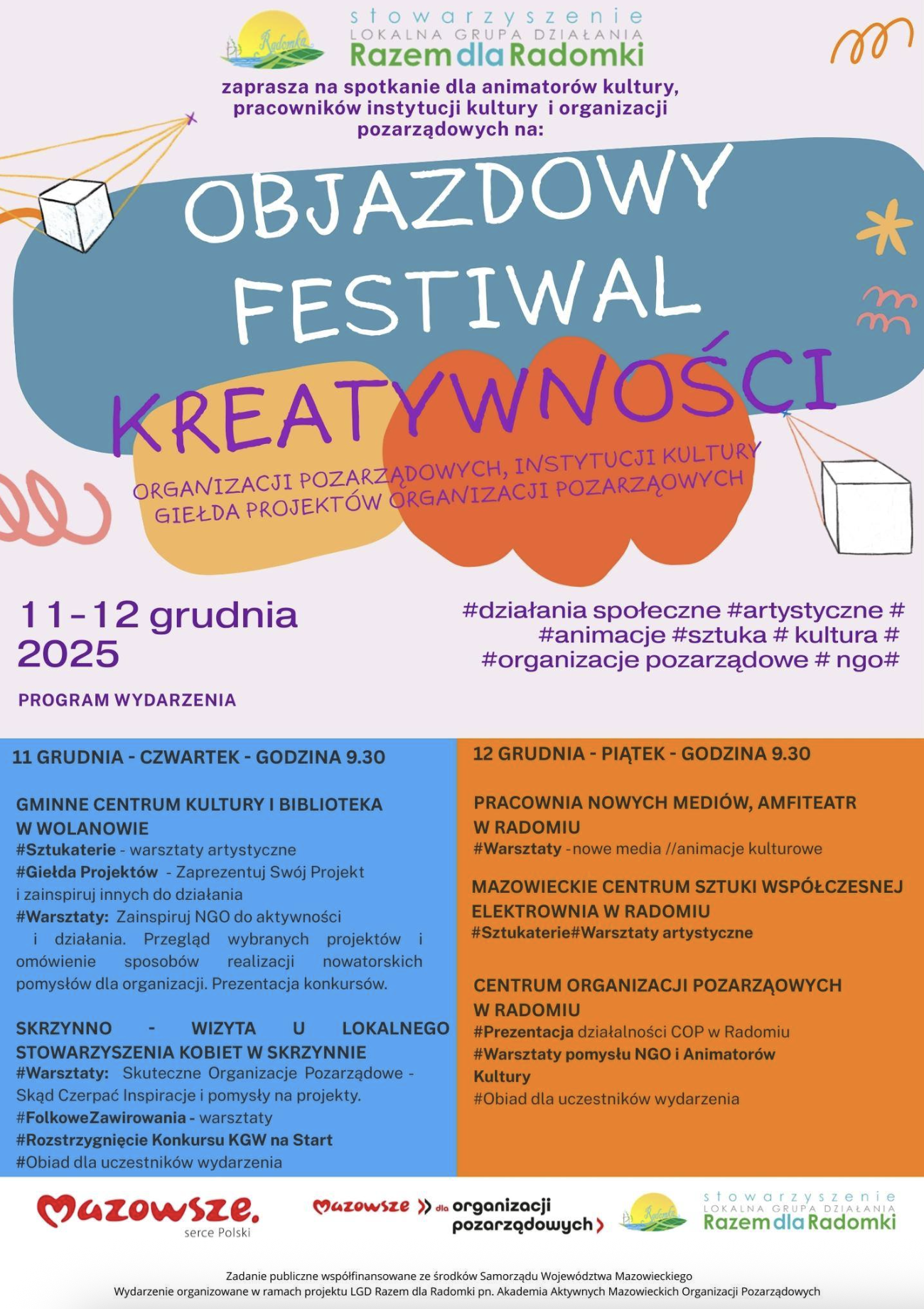 LGD Razem dla Radomki serdecznie zaprasza animatorów kultury, pracowników instytucji kultury oraz przedstawicieli organizacji pozarządowych na wyjątkowe, inspirujące wydarzenia: Objazdowy Festiwal Kreatywności organizacji pozarządowych, instytucji kultury, giełda projektów NGO.