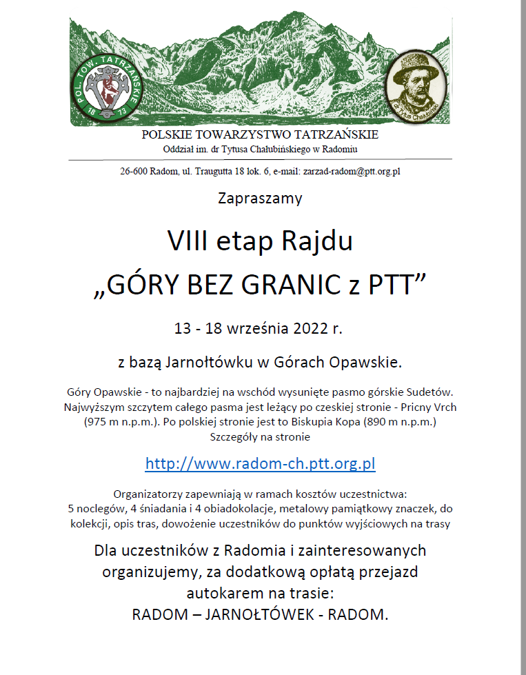Zapraszamy do wzięcia udziału w VIII etapie Rajdu „GÓRY BEZ GRANIC Z PTT”, który odbędzie się w dniach 13 – 18 września 2022 r. z bazą w Ośrodku konferencyjno – wypoczynkowym „Ziemowit” w Jarnołtówku w Górach Opawskich.